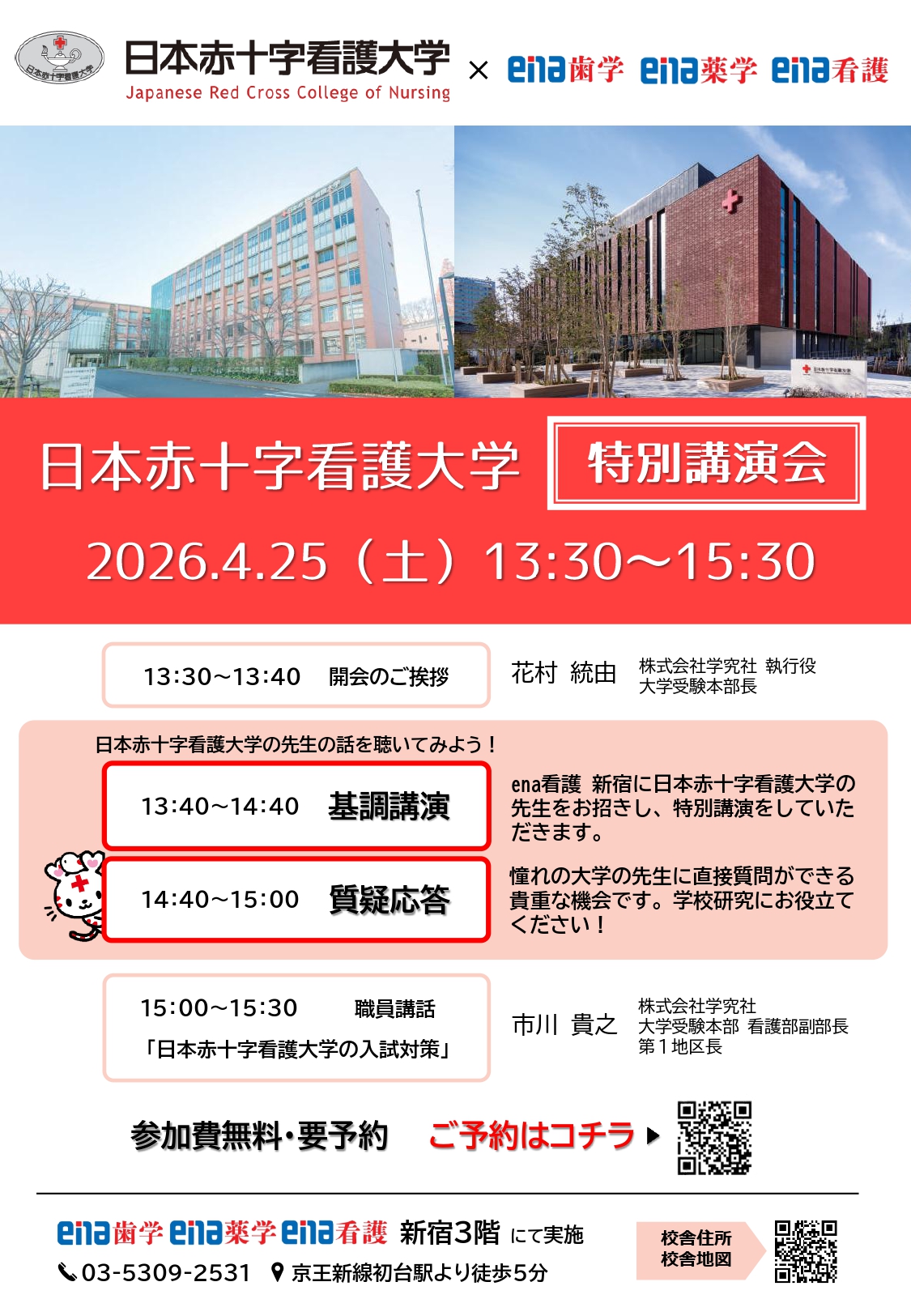 なんと、日本赤十字看護大学の先生をena看護 新宿校にお呼びし、基調講演と質疑応答をしてくださいます!!