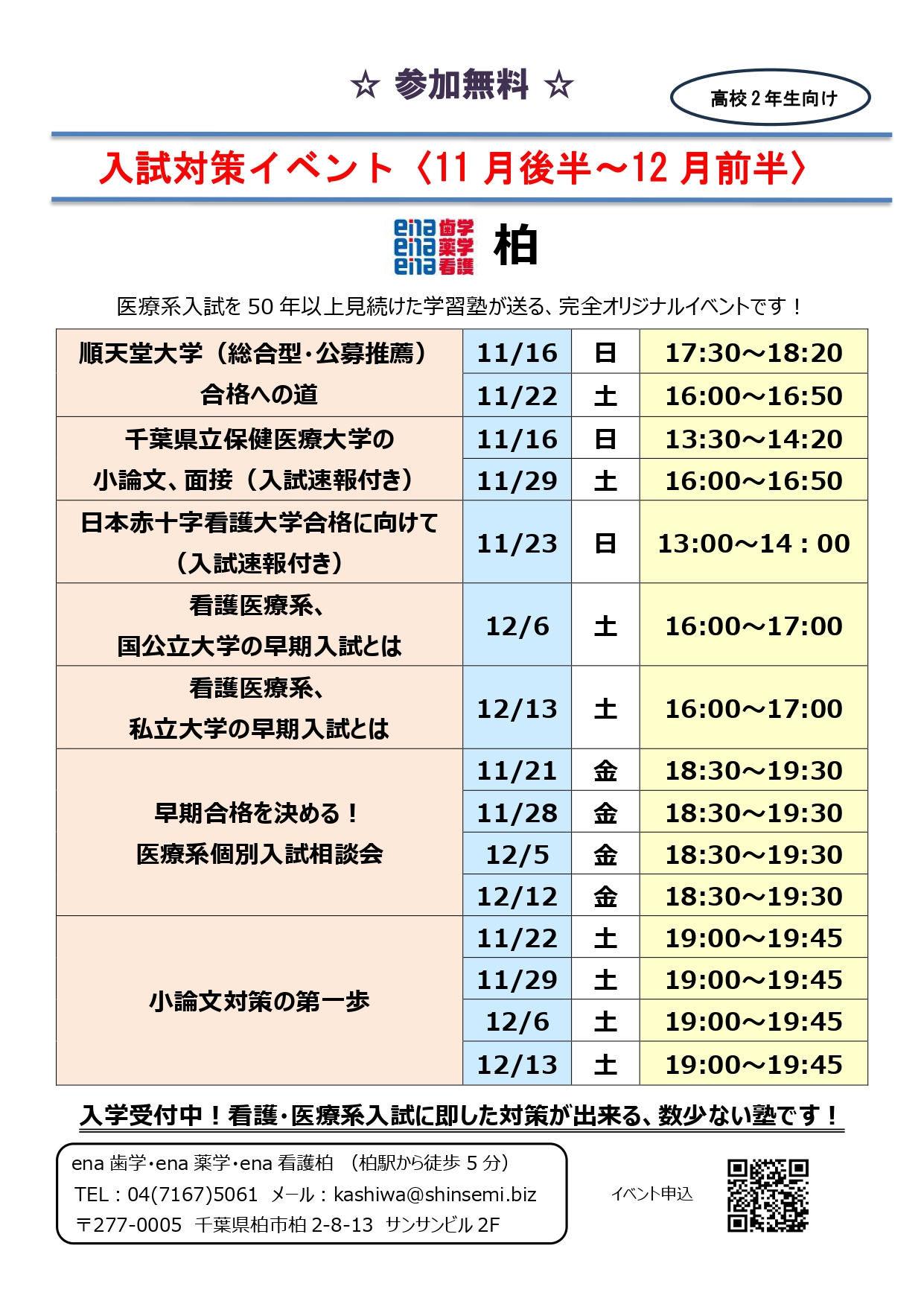 特に順天堂大学、千葉県立保健医療大学、日本赤十字看護大学は今年の入試速報も交えてお話ししますので、来年の受験をご検討されている方はぜひご参加ください。